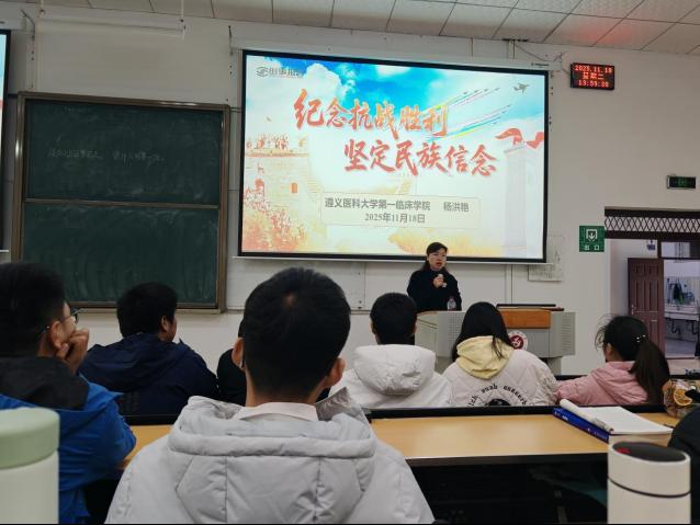 2025年11月18日,太阳成集团122ccvip太阳成集团122ccvip党委副书记杨洪艳以“纪念抗战胜利,坚定民族信念”为主题,为2024级临床6班至9班的同学们带来了一堂兼具历史厚度与精神温度的深度教学课。