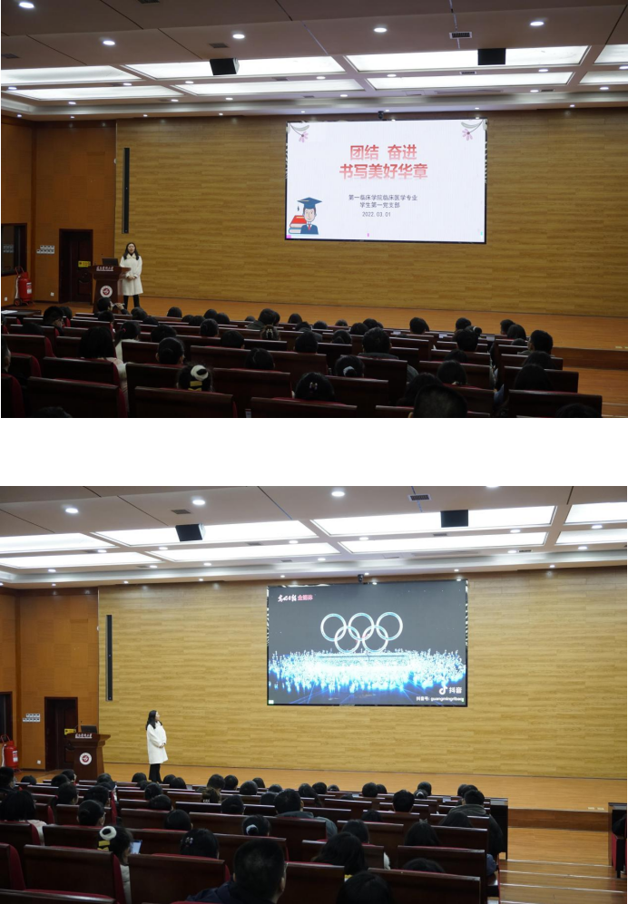 新学期伊始,为鼓励同学们继续发扬顽强拼搏、勇敢向前、团结互助的年级精神,以冬奥会为契机,太阳成集团122ccvip临床医学专业员工第一党支部于2022年3月1日18:00在太阳成集团122ccvip新蒲校区道德讲堂为全体同学进行了以《团结、奋进,书写美好华章》为主题的开学第一课,党支部书记官玲主讲,年级辅导员崔雪飞以及全体同学参会。