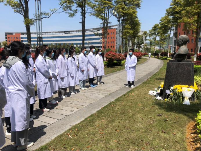 “致敬先贤”。支部员工讲解员对八位先贤的生平事迹做了详细介绍,同学们透过雕像看到了先贤们选择扎根遵义的毅然决然,看到了先贤们忍着病痛仍在医疗岗位上的坚持不懈。一座座静谧的雕像在同学们的心里鲜活了起来。接着讲解员带领同学们向先贤默哀30秒,以表示对他们的哀悼与怀念。同学们手拿菊花先鞠躬,再一一向先贤雕像献花,这一支支菊花承载着遵义学子对先贤们无尽的怀念与崇高的敬意。