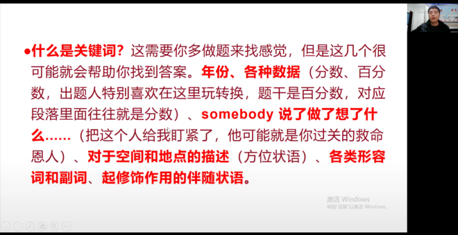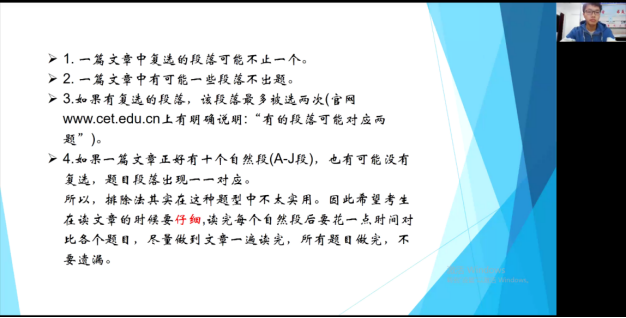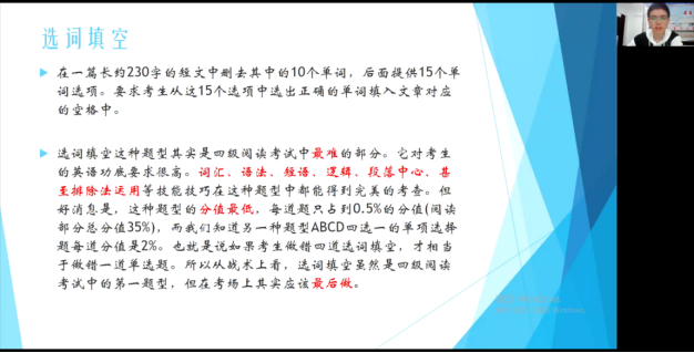 略读细品,针对阅读。邹佳宇同学主要分享英语四级中段落匹配题型的应考技巧、单词积累的重要性,并且根据题型的特殊性提出“关键词”技巧,通过关键词定位法,能大大提高做题效率。