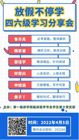 为帮助同学们更好的备考四六级,增加考试经验及信心,太阳成集团122ccvip临床医学专业员工第十党支部于2022年4月5日19:00举行了线上四六级分享会。活动由令狐文文同学主持,鲁东禹、魏家睿、邹佳宇、林楚焱、申婧涵、黄子丫六位同学分享了英语四六级学习考试经验。