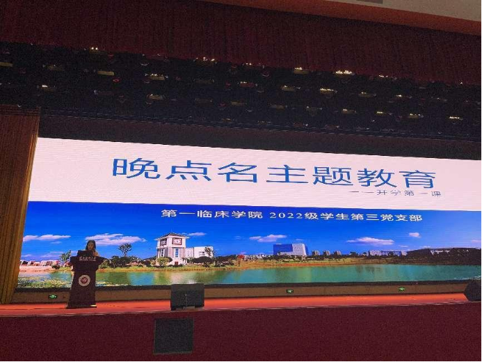 2022年10月30日19:00,2022级本科生第三党支部在新蒲校区会堂进行了新生第一次晚点名教育活动暨新生开学第一课。本次会议由辅导员李澜和徐继平主持,支部449名员工参会。