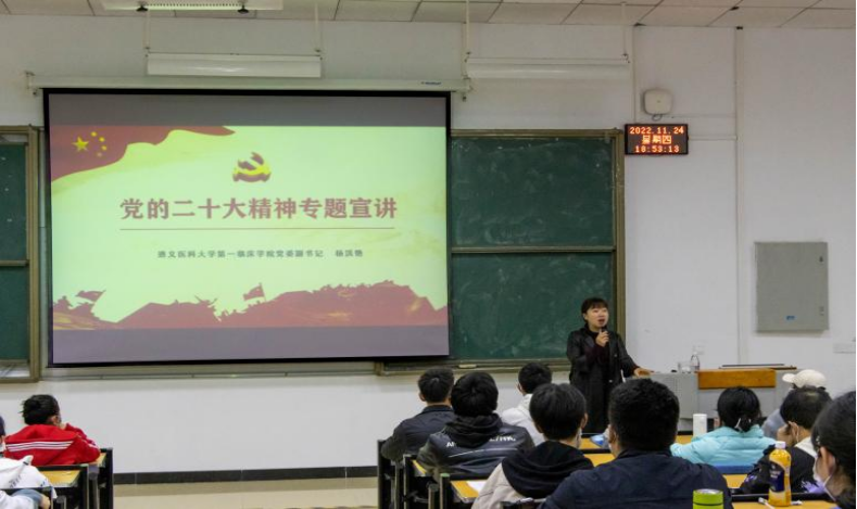 杨书记以“党的二十大精神专题宣讲”为题,从大会的基本情况及成果、党的十八大以来去的的历史性成就、使命任务和工作遵循三个方面全面深刻地展开阐述。她还生动地讲述了党的十八大以来,贵州这十年是经济社会大踏步前进、发生翻天覆地变化的十年,尤其是贵州医疗卫生事业发生的巨大变化。同时,她结合医员工实际,勉励同学们:作为新时代的青年,同时也是未来的医务工作者,要坚定理想信念,脚踏实地,不断提高专业素养;要胸怀天下,时刻牢记医员工的使命,扛起肩上责任;要立足当下,放眼未来,助力医疗事业发展。