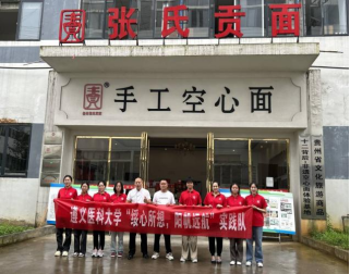 第二站,在宝林张氏贡面研学实践基地,第九代传承人张永贵师傅向我们介绍了空心面的历史背景和独特之处。绥阳空心面又称“手工盐面”“银丝面”“空心盐面”,是绥阳有名的特产,流传民间已有数百年历史,采用古老手工艺制作,其面细如发丝,色白如银,中空透气,堪称一绝,在2015年还获得省级非物质文化遗产认可。清咸丰年间,绥阳空心面曾作为贡品进献咸丰皇帝,成为清宫御膳食品之一。接着张师傅带领实践队参观了生产车间并学习绥阳空心面制作过程,实践队成员亲手参与了揉面、搓面、盘面、上杆、抻面等过程,越发感受到能吹泡泡的空心面的独特之处。张师傅还介绍了他们公司实行的“品牌+合作社+农户”的生产模式,带动周边群众就业300余户。小小的空心面,大大的学问,72道大小工序,全部由手工完成,几十年如一日的传承,好面“匠”制。