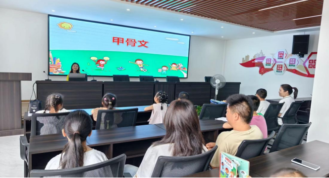 一路“童”行伴成长,文化传承永不忘。7月18日8:30,实践队以甲骨文为钥,开启了一场穿越时空的文化盛宴。团总支同学曾意以“日”“月”“山”“水”等生动实例,揭秘甲骨文的造字奥秘与独特韵味,引领小朋友们遨游于古老文字的海洋。现场互动热烈,孩子们的好奇心与探索欲被点燃,为中华优秀传统文化的传承播下希望的种子。