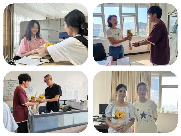 未出席到本次会议的老师们还在工作位上默默耕耘,但在这温馨的一天,鲜花永远不会缺席。于是大家手捧着鲜花来到员工处、校团委、招就处和后勤处,老师们在我们的到来中脸上洋溢着幸福的笑容。鲜花真正的被赋予了意义,是员工们感恩的象征,敬意的寄托以及美好祝愿的承载。