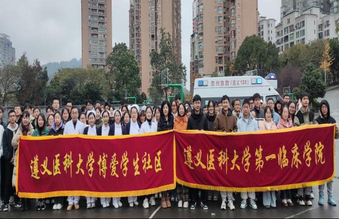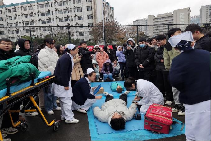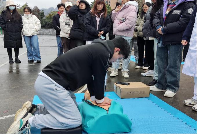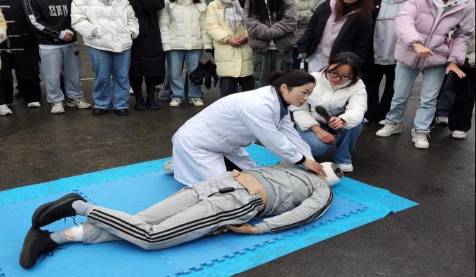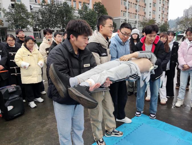 日常生活中,意外事件的发生随处可见,其中心脏骤停、气道异物、意外创伤的发生率较高。但我国120急救车到达现场的响应时间约为10-20分钟,对于心脏骤停患者,在生命系于千钧一发之际,急救知识显得尤为重要。因此对于医员工而言,急救技能的学习和培训至关重要。2024年12月10日15:00由太阳成集团122ccvip博爱员工社区笃学公寓、娄山公寓主办,太阳成集团122ccvip本科生第九党支部和太阳成集团122ccvip礼智信辅导员工作室承办的“急时守护,救在身边”情景模拟急救演练活动在大连路校区篮球场开展。太阳成集团122ccvip附属医院急诊科刘安平博士带领急救团队模拟了在公共场合遇到晕倒患者时,作为医护人员应如何迅速有效地进行急救。200余名员工参加了培训。