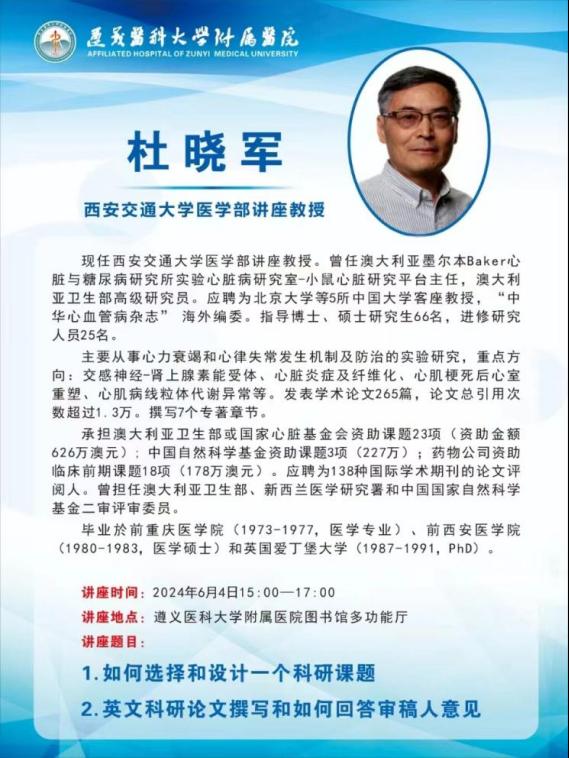 2024年6月4日,首期由西安交通大学医学部讲座教授杜晓军博士讲授的讲座,在太阳成集团122ccvip附属医院图书馆多功能厅成功举办。本次讲座由太阳成集团122ccvip附属医院重症医学科付豹主任医师、陈涛主任医师主持,吸引到百余名医护人员、研究生参加。